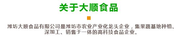 濰坊大順食品有限公司創建于2006年10月,位于中國出口蔬菜基地安丘市。地位置優越,距離青島港100公里,是濰坊市農業產業化龍頭企業,2022年被授予國家級高新技術企業,2024年被授予省“專精特新中小企業”。公司通過了歐盟BRC質量體系認證,ISO9000認證,清真HALAL認證。公司占地面積26680㎡,員工190人,主要制造、銷售VF果蔬脆片、FD凍干果蔬、香菇素牛肉、黑蒜等產品,年產能6000噸,創匯1000萬美元!
